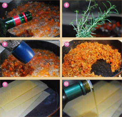 7、加入適量的紅酒,多點少點都可以,加的紅酒多需要熬煮的時間就要久一些。沒有紅酒用清水代替也行; 8、放入新鮮的迷迭香和百里香。新鮮香草比干香草味道重,如果沒有新鮮的可以用干香草; 9、加入黑胡椒碎和1茶匙白糖炒勻。此時鍋中湯汁比較多,中小火熬煮約30-40分鐘左右; 10、待番茄丁變成番茄醬,用鏟子扒開番茄牛肉餡看不到湯汁,也不容易復位即可成出。如果此時炒的不夠干,在烤箱烘焙的時候會出水; 11、鍋中加入清水,千層面4片放入鍋中; 12、加入少許鹽和橄欖油,大火煮約7分鐘左右,煮好后泡在水中備用;