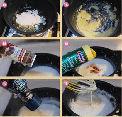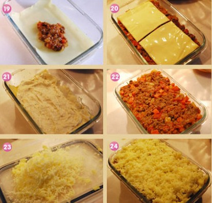 13、黃油入鍋,小火融化。加入面粉(高筋粉或者中筋粉都可以); 14、用勺子或者蛋抽順著一個方向攪拌至無干粉; 15、慢慢的加入牛奶,邊加入邊攪拌。加入少許豆蔻粉; 16、再加入奶酪粉,拌勻; 17、加入研磨的黑胡椒碎; 18、繼續(xù)順著一個方向攪拌至上勁粘稠,舉起蛋抽低落的白醬不容易消散為止; 19、最后就是組合了,可以在器皿內(nèi)涂少許油,如果不打算倒扣出來也可以不涂。鋪一張煮好的千層面皮,放入番茄牛肉餡; 20、鋪滿番茄牛肉餡后,放入2張車達奶酪片。如果沒有可以用馬蘇里拉代替,就是馬蘇里拉用料需增量; 21、再鋪上一張面皮,涂抹上白醬; 22、然后是千層面皮,涂抹番茄牛肉餡。按照順序從最底層的面皮+番茄牛肉餡+2片芝士片+面皮+白醬+面皮+番茄牛肉餡+2片芝士片+面皮+番茄牛肉餡+馬蘇里拉碎; 23、最上面的一層我鋪滿了番茄牛肉餡,因為覺得番茄牛肉餡多一些,想必會比白醬多一些好吃; 24、刨出馬蘇里拉碎,凍硬的馬蘇里拉更好刨一些; 25、在番茄牛肉餡上面撒上厚厚的馬蘇里拉。放入預熱好的220度烤箱中層,加熱約30分鐘左右,表面上色即可。