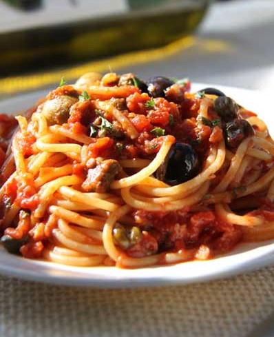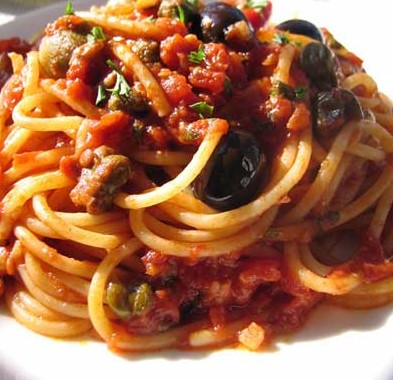 蒜香番茄鳀魚面 原料:水管面160克(我用的通心粉7號(hào),因?yàn)榘骋粋(gè)人吃,只煮了80克左右)、番茄醬汁150克、鳀魚2片(10克)、黑橄欖4顆、綠橄欖4顆、白葡萄酒20ml、紅辣椒1/2根、雞高湯60ml、醋漬酸豆15克、蒜香橄欖油2大勺(30ml)、荷蘭芹(parslev)1大根、初榨橄欖油1/2大勺(8ml)、帕馬森干酪(粉狀)10克、鹽適量、胡椒適量。 做法: 1、準(zhǔn)備好所需材料并稱量好所需用量; 2、平底鍋加熱蒜香橄欖油; 3、至冒泡時(shí)加入去籽后的紅辣椒; 4、加入酸豆和鳀魚,邊炒邊壓碎鳀魚; 5、加入白葡萄酒去腥; 6、加入黑、綠橄欖混拌; 7、加入番茄醬汁; 8、再加入雞高湯拌勻; 9、加鹽、胡椒粉調(diào)味; 10、烹煮片刻; 11、鍋里放入大量的水,水開后加入適量的鹽,雙手扭轉(zhuǎn)通心粉垂直放開(俺滴鍋不夠深哈); 12、通心粉自動(dòng)下沉后,輕輕混拌,按說明煮好面;