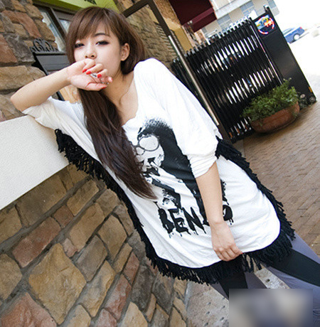 蝙蝠袖吸血鬼頭像寬松長袖衣,款式的 蝙蝠衫 的設(shè)計加上流蘇絕對有范兒,野性的吸血鬼頭像 雖然說白色和黑色,但是放在一起覺得是顯眼的很呢,蝙蝠袖的設(shè)計 初秋季很合適的喲 ,而且寬松的款式 不限身材還很顯瘦的說~