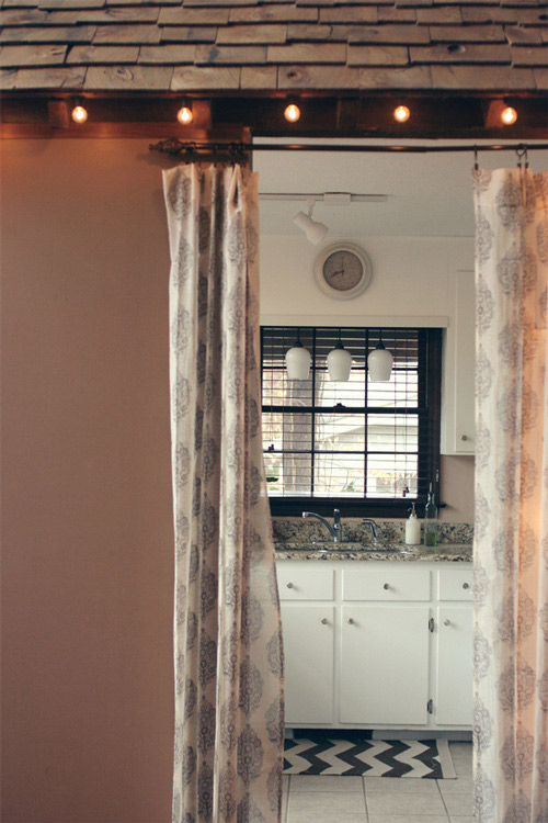 代替單調(diào)無趣的臺燈,正方形盒子造型的串燈不僅能起到臺燈的作用,還能豐富房子的燈光線條的層次性,讓設(shè)計充滿樂趣。床頭板后面的墻壁加上淡黃色的蕾絲薄紗,讓寢室充滿了隱私的特質(zhì)。