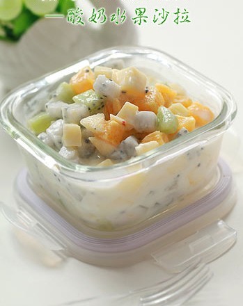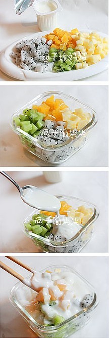 1、將所有材料去皮切小丁,放在大碗中,淋入酸奶,