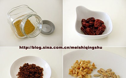小米150克、紅棗5-10顆、花生碎少許、瓜子仁少許、紅糖10克。