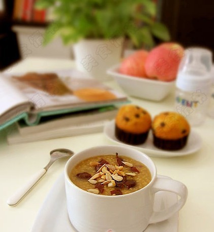 1、備齊材料:小米,紅棗,紅糖和果仁。果仁可以整粒放入,也可切碎后加入;