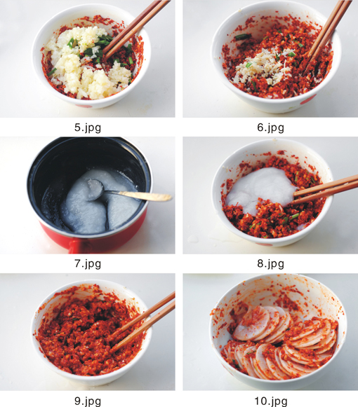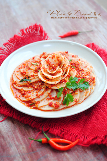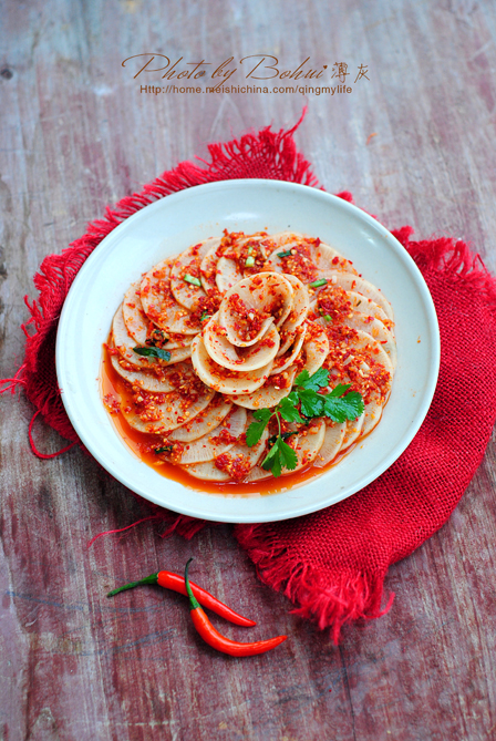 這里的蘿卜可以也切成丁狀,但是灰采用了片狀,不僅更入味,并且花上那么一點小心思,蘿卜也可以開出美麗的花朵。在大魚大肉中,來一盤辣蘿卜,解膩又開胃哦,小涼菜也可以宴客,而且還能扮靚你家的餐桌哦。 時間計算失誤,拍照時都快四點半了,趕最后一點光線,拍的急急忙忙的,要不然中間那朵花造型我一定可以做的更好看點 材料: 白蘿卜1個、蝦皮一小撮、韭菜幾根、辣椒面60克、蘋果1/3個、梨1/3個、姜2片、蒜5瓣、鹽適量、白糖1小匙、魚露30毫升、糯米粉10克、清水90克 做法: 1、準備所需材料。 2、白蘿卜撒少許鹽,腌制20分鐘至蘿卜片菜變軟,倒去腌出的水。 3、蘋果、梨切成碎末;白蘿卜刨成絲;蒜、姜切碎末,韭菜洗凈切成段,蝦皮剁碎備用。 4、將魚露倒入辣椒面中。 5、再加入切碎的蘋果、梨、姜蒜末、白蘿卜絲、韭菜、糖、鹽。 6、再加入切碎的蝦皮拌勻。 7、糯米粉10克與90克清水攪勻,小火煮成漿糊狀。 8、煮好的糯米漿糊倒入辣椒醬中. 9、拌勻。 10、將蘿卜片上均勻的沾上辣椒醬。腌半天以上即可以食用。 灰灰小貼士: ◎此做法同樣適用于辣白菜,不過白菜需要腌制8小時以上至白菜變軟。 ◎韭菜可以加速辣白菜的發(fā)酵,并且起到增香的作用。 ◎蝦皮是用來代替蝦醬的,有蝦醬更好,用蝦皮也不錯。 ◎糯米粉糊可以更容易掛槳,有粘稠感,并且發(fā)酵出來味道更好。煮的時候要用涼水攪勻,煮的時候要攪拌防止糊底。 ◎魚露在大型超市里都有售,可以保證辣白菜的風味,建議不可缺少,如果實在買不到,也可以不放。 |