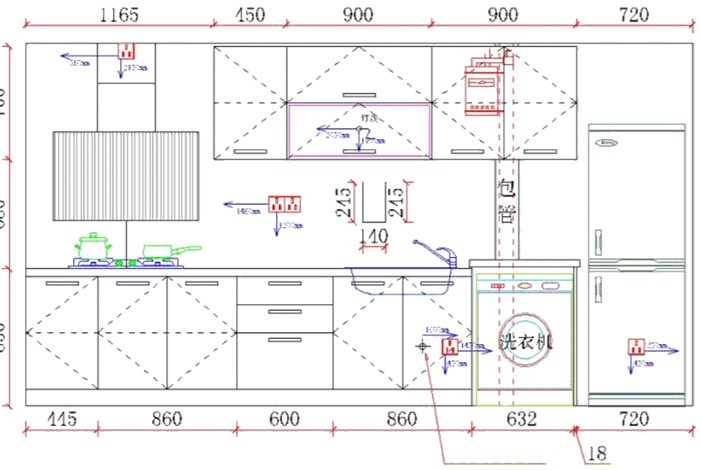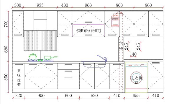 這樣就形成了這個方案:進(jìn)門對面開始,先灶臺—操作臺—水盆—洗衣機(jī)—冰箱—窗戶。這個方案無視了燃?xì)夤艿,操作臺的寬度也算夠了。