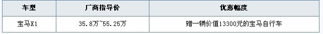 從永康寶驛4S店獲悉,現(xiàn)訂購(gòu)寶馬X1即可獲贈(zèng)一輛價(jià)值13300元的寶馬自行車(chē),數(shù)量有限。感興趣的朋友們不妨到店詳詢,具體優(yōu)惠信息詳見(jiàn)下表: