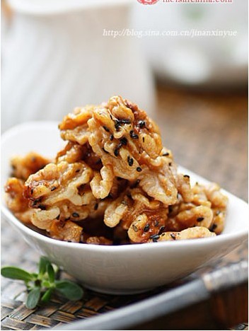 它烏發(fā)、潤燥、抗衰老、保護(hù)心臟...吃核桃的好處一大堆,但生吃的時侯總被它微微的苦澀所打倒,吃上一個倆,就扔下了。琥珀桃仁,蜜糖包裹著油光锃亮的核桃,討取了很多人的歡心。雖好吃,但油炸食品畢竟不夠健康。下面我要說的這種超簡單快捷的方法,非油炸,只需三分鐘,自己在家也能做出可口松脆的琥珀核桃仁。再懶,也不要忘記保養(yǎng)自已,再懶,3分鐘時間也是有的,一份小零嘴兒,勝似補(bǔ)藥,關(guān)愛自己,親手做起。 原料: 核桃仁125克、黃油12克、蜂蜜20克、綿白糖20克、黑芝麻8克。 做法: 1、核桃仁裝盤子里,進(jìn)微波爐,不加蓋高火1分鐘; 2、取出,調(diào)入蜂蜜、白糖、黃油拌勻,不加蓋進(jìn)微波爐高火2分鐘; 3、取出趁熱撒上黑芝麻拌勻,再入微波爐中火20秒,取出拌勻,平攤到盤子里放涼就可以吃了。