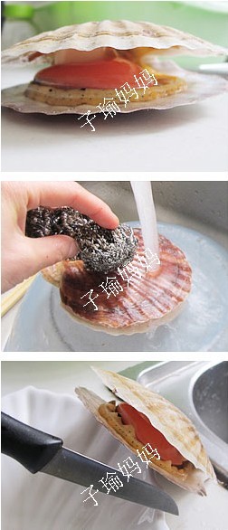 2、將扇貝清洗干凈,去貝殼,摘去沙線,沙囊,睫毛狀。裙邊可留可不留,留裙邊的話,將裙邊反復(fù)刮洗干凈;