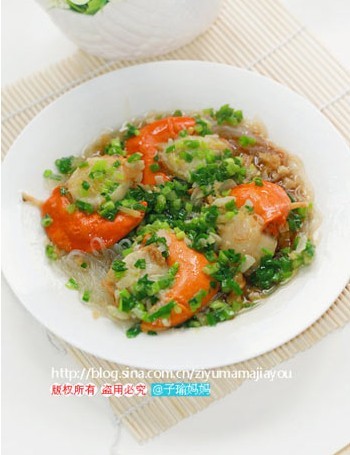 3、將粉絲鋪在盤底,放上日月貝,撒上少量料酒,撒上姜蒜末,淋入適量蒸魚豉油。