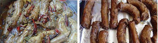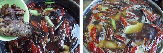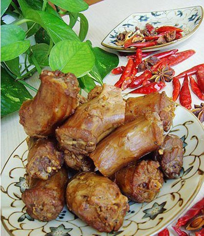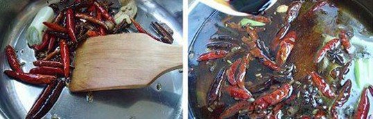 原料:鴨脖、干辣椒、花椒、老抽3勺、醬油2勺、鹽1勺、冰糖、姜、蔥、料酒、老鹵料、甘草、肉蔻、陳皮、香葉、八角、桂皮。 做法: 1、將鴨脖子脖洗凈,切段; 2、鍋入加適量水、下入蔥、姜段煮沸,倒入雞脖去除血腥等雜質(zhì),撈出放到溫水里洗凈; 3、鍋置火上少許油燒熱后下入干辣椒、花椒、姜片、蔥段爆香; 4、倒入清水,加1勺料酒、3勺老抽、2勺醬油、料包煮制5分鐘;