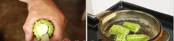 注: 用熱水焯過的苦瓜一定要放到?jīng)鏊锝荩蝗徊淮。焯過水的苦瓜,苦味沒有那么明顯,已經(jīng)減少一半了。