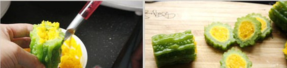 5、把咸蛋黃塞到苦瓜里; 6、把塞好咸蛋黃的苦瓜段切成厚片。吃的時(shí)候在每片上點(diǎn)上一滴蜂蜜。