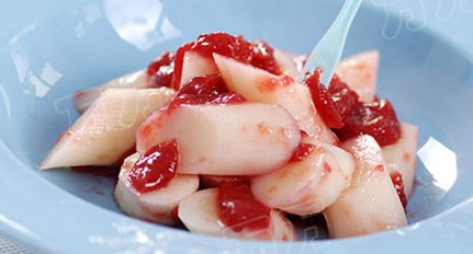 原料: 淮山藥1根、櫻桃醬適量。 做法: 1、淮山洗凈,櫻桃醬備用。 2、淮山用刮皮刀刮去外皮;瓷酵馄さ拿约罢骋喝菀鬃屓诉^敏發(fā)癢,所以去皮時(shí)最好帶手套。 3、去皮后的山藥徹底洗凈,放入盤中,入蒸屜蒸20分鐘左右至熟。用筷子輕易扎透即可。取出過涼,然后切小段,或者薄片都可。 4、拌上櫻桃醬,入冰箱冷藏半小時(shí)即可食用。冰涼綿軟,酸甜可口,制作簡(jiǎn)單且非常好吃。