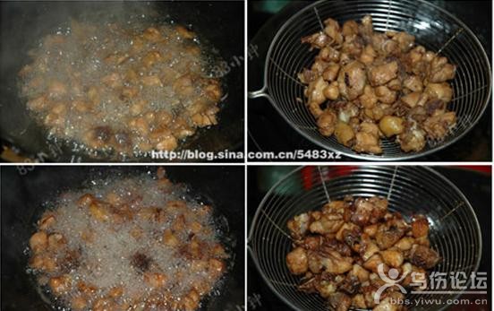 雞肉的絕對(duì)誘惑--辣子雞丁 很代表性的川菜哈,要顏色有顏色,要口感有口感。。。絕對(duì)誘惑! 原料:雞腿、干紅辣椒。 調(diào)料:花椒、姜、蒜、鹽、料酒、醬油、白糖、蔥、雞粉、白芝麻。 做法: 1、雞腿剁成小丁,加適量鹽,料酒,醬油腌制入味。干紅辣椒剪成段,姜蒜切片,準(zhǔn)備少許花椒粒; 2、鍋里放多些,油料以能沒過雞塊為好。油熱后,下腌好的雞塊炸至表面金黃后起鍋; 3、鍋里油再次加熱,再下入雞塊,炸至表面更黃,而且雞塊表皮稍脆; 4、鍋里留少許底油,下姜蒜炒至出香味。加花椒,干紅辣椒段煸至出麻辣香味; 5、倒入炸好的雞塊,加適量白糖,雞粉提味。撒上蔥段,白芝麻炒勻即可。