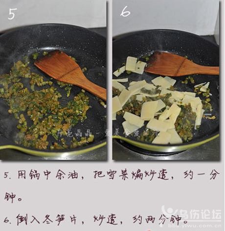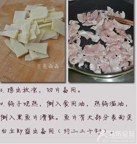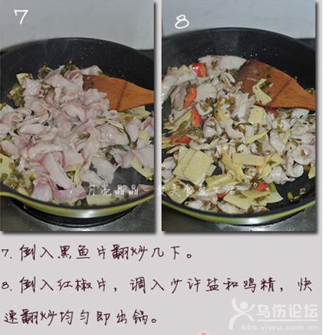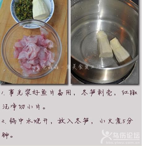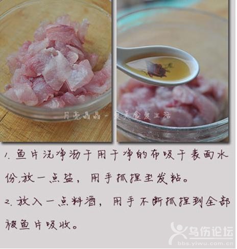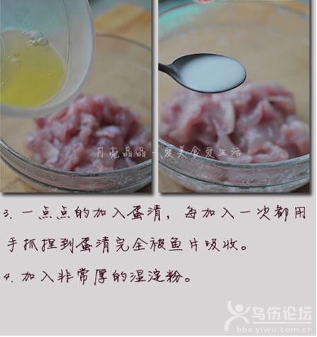 魚(yú)片,屬于萬(wàn)人愛(ài),但是好多人跟我說(shuō)自家做的魚(yú)片就是怎么都做不滑嫩,也裹蛋清了,也放淀粉了,入鍋一炒或者一煮,立馬老了。其實(shí)魚(yú)片要想做的滑嫩,還是很有講究的,把魚(yú)片上漿以及入鍋后的溫度及時(shí)間,都掌握好,就能做出滑嫩好吃的魚(yú)片來(lái)。我就圖文并茂,把我自己漿魚(yú)片的經(jīng)驗(yàn)介紹給大家吧。文章中紅色字體是做出滑嫩魚(yú)片的關(guān)鍵,希望大家都在家里就能用最簡(jiǎn)單的方法做出滑嫩好吃的魚(yú)片。 【關(guān)于魚(yú)片】 魚(yú)片這種原料不同于肉絲、牛柳,因?yàn)轸~(yú)片本身含水量比較足,肉質(zhì)相對(duì)鮮嫩,所以不像漿肉絲、牛柳等原料需要充分“吃水”和漲發(fā),才能保證滑嫩口感,對(duì)于魚(yú)片、蝦仁這些原料來(lái)說(shuō),上漿只需有效控制水分,一般加適量的、少量蛋清和淀粉,并拌入清油即可。但是上漿步驟中加料的順序和操作細(xì)節(jié)還是需要好好把握的。 雪菜黑魚(yú)片 【如何漿魚(yú)片】 原料: 魚(yú)片(整條一斤多點(diǎn)的黑魚(yú),片出來(lái)的魚(yú)片)、鹽一小撮、料酒一茶匙(5ml)、蛋清半個(gè)、厚的濕淀粉一茶匙(5ml)。 1、魚(yú)片洗凈瀝干用干凈的布吸干表面水份(如果操作環(huán)境干凈,也可以不洗)。魚(yú)片中放一點(diǎn)鹽,用手抓捏至發(fā)粘。 2、 放入一點(diǎn)料酒,用手不斷抓捏到全部被魚(yú)片吸收。 3、一點(diǎn)點(diǎn)的加入蛋清,每加入一次都用手抓捏到蛋清完全被魚(yú)片吸收。 4、加入非常厚的濕淀粉。 5、不斷抓捏到全部裹在魚(yú)片表面,發(fā)粘沒(méi)有水份,靜置。 6、入鍋前加入一些食用油拌勻。 【碎碎念】 1、漿魚(yú)片要注意的是,不能所有材料一起放入,要分步來(lái),按照鹽->料酒->蛋清->厚的濕淀粉,這樣的順序來(lái)加,每次加的量不能多,要用手抓捏到完全被魚(yú)片吸收再放下一次料。 2、蛋清的量不要多,一般整條為一斤多的黑魚(yú)片出來(lái)的魚(yú)片,放半個(gè)蛋清就夠了,蛋清放多了,炒的時(shí)候魚(yú)片表面會(huì)感覺(jué)不干凈。 3、漿好的魚(yú)片入鍋前記得要放一小勺食用油拌勻,這樣入鍋后魚(yú)片不容易粘鍋 ,魚(yú)片之間也不會(huì)粘連在一起。 雪菜冬筍黑魚(yú)片 原料: 漿好的黑魚(yú)片、冬筍、新鮮雪菜(雪里蕻)、紅椒。 調(diào)味: 鹽、雞精。 做法: 1、事先漿好魚(yú)片備用,冬筍剝殼,紅椒洗凈切小片。 2、鍋中水燒開(kāi),放入冬筍,小火煮5分鐘。 3、撈出放涼,切片備用。 4、鍋?zhàn)訜裏幔谷胧秤糜,熱鍋溫油,倒入黑魚(yú)片滑散。魚(yú)片有大部分表面變白立即盛出備用(約二三十秒)。 5、用鍋中余油,把雪菜煸炒透,約一分鐘。 6、倒入冬筍片,炒透,約兩分鐘。 7、倒入黑魚(yú)片翻炒幾下。 8、倒入紅椒片,調(diào)入少許鹽和雞精,快速翻炒均勻即出鍋。 【碎碎念】: 1、滑魚(yú)片,油溫不能高,熱鍋溫油就把魚(yú)片放入,用筷子滑散開(kāi)?吹藉佒恤~(yú)片大部分由透明變白立即盛出。千萬(wàn)不要等全部變白了再盛出,那樣后面再入鍋和其它材料混合炒至,魚(yú)片就太老了。 2、冬筍焯水后食用,可去草酸,促進(jìn)鈣吸收。還可以縮短后面入鍋炒至的時(shí)間。
