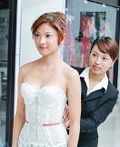 測量尺寸時新娘所需準備的衣物及穿著。如果決定結(jié)婚那天在婚紗內(nèi)穿著塑身衣,就在量尺寸當天穿上選好的塑身衣測量,如果新娘胸部較小,可加上一個胸墊測量胸圍或者向設(shè)計師要求在婚紗里加一個胸墊。此外,婚紗的具體長度要考慮到婚禮當天鞋子的高度,可穿著一雙你認為高度合適的鞋子來量尺寸,對確定衣長很有幫助!
