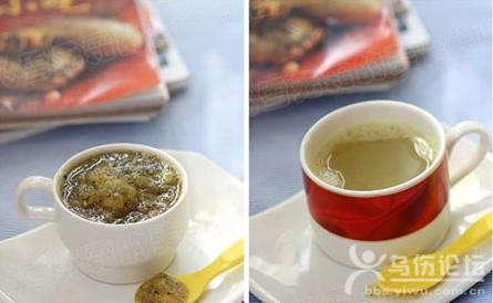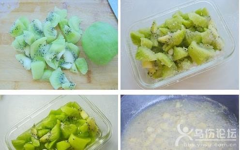 小小的獼猴桃不光生食好吃,用來(lái)做果醬和果茶味道也不錯(cuò)。如果喜歡混合果醬的,可以加些草莓蘋果一起哦。 原料: 獼猴桃兩個(gè)、白糖30克、麥芽糖2匙。 做法: 1、將獼猴桃去掉皮后,切成小塊。 2、放在容器中,灑上白糖,放四個(gè)小時(shí)。 3、四小時(shí)后,果肉會(huì)變小不少。 4、將果肉放入攪拌器中攪拌成碎狀,再倒入鍋中,慢慢用小火煮至濃稠加入麥芽糖混合均勻即可。 飛雪有話說(shuō) 1、如果喜歡喝果茶的,可以放一匙在白開(kāi)水中即可。 2、根據(jù)獼猴桃的酸度決定是否再加檸檬汁。 3、糖量放得越多,保存的時(shí)間也就越長(zhǎng)。 4、獼猴桃本身是綠的,可是煮過(guò)后,有些變黃色。 5、煮醬的鍋千萬(wàn)別用鐵的。 |