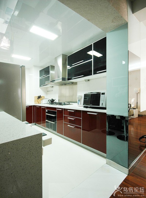廚房里墻壁包括吊頂都是淺色系的材料。這樣看來(lái)廚房會(huì)明亮一些。