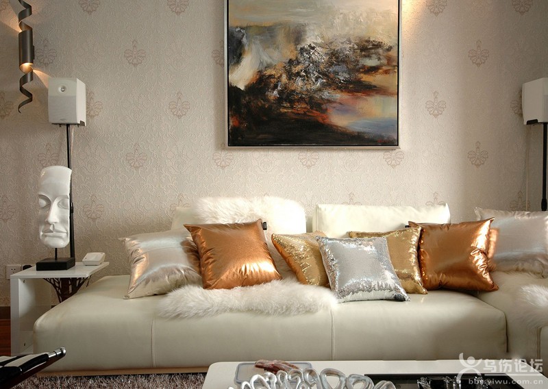 客廳的沙發(fā)背景墻鋪貼的壁紙,淺色的沙發(fā)搭配金色的靠墊