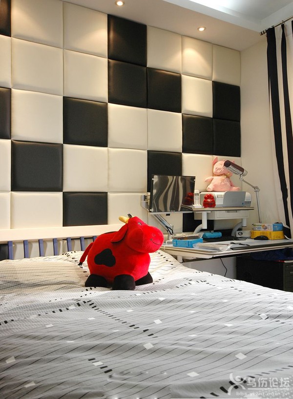 兒童房臥室比較素凈,床頭軟包的黑白相間的格子圖案。