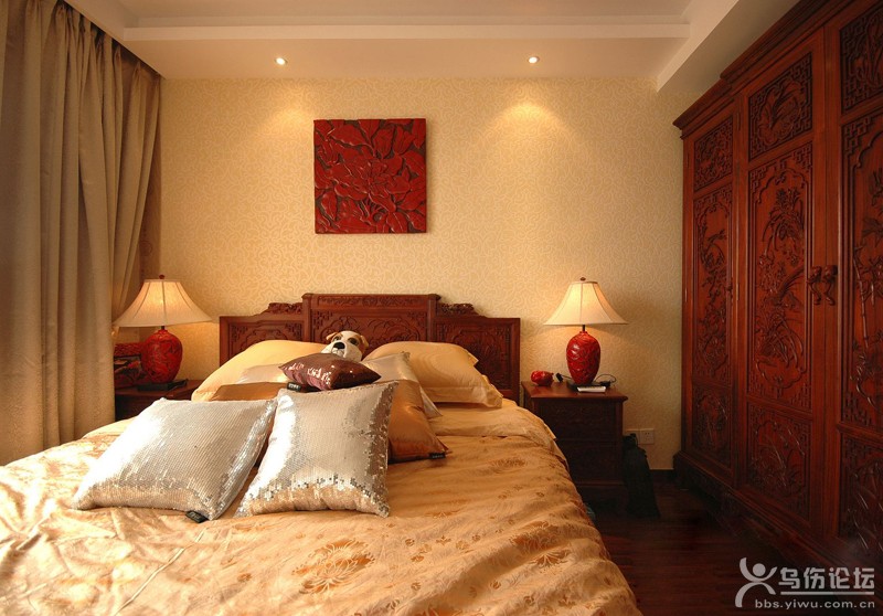 主臥室的家具都是紅木色的墻壁顏色淡黃色