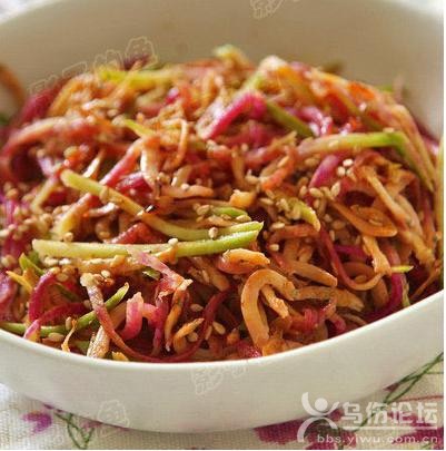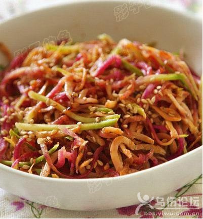 2、蘿卜切細(xì)絲和小魚(yú)干一起加辣椒醬、糖、麻油拌勻即可。灑上些炒熟的白芝麻,沒(méi)有也可不加。