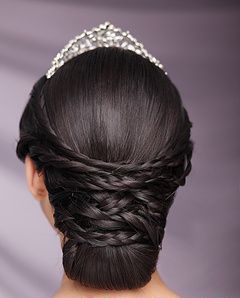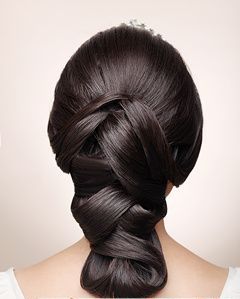 造型技法:把劉海三七分,自左右兩個(gè)鬢角處各取頭發(fā)少許,分別以外翻的手法向腦有層次的收起,將兩側(cè)的發(fā)片交匯于腦后并固定,在將發(fā)尾的發(fā)片同樣利用外翻的手法固定在上一層頭發(fā)的里面即可。