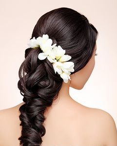 造型技法:將頭發(fā)分為三區(qū),后發(fā)區(qū)和兩個(gè)側(cè)發(fā)區(qū),把頭頂區(qū)倒梳打蓬后梳光表面,在把后發(fā)區(qū)的頭發(fā)扎個(gè)馬尾,利用外翻的手法把發(fā)尾收起留作造型,然后用扭的手法依次將兩側(cè)區(qū)的頭發(fā)在梳好的發(fā)髻上固定。 2012年最新韓式新娘發(fā)型2、韓式浪漫大卷新娘