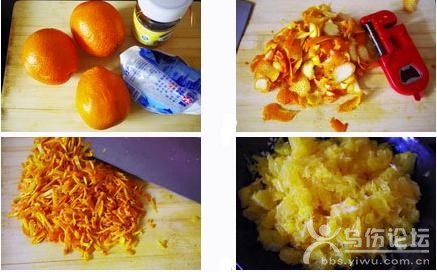 1、用削土豆皮的刮刀,把橙子外皮薄薄地削下來,切成細(xì)絲;
