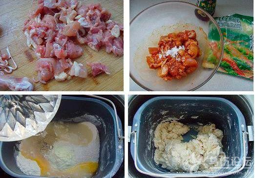 餡料、餅坯及烤制: 1、雞腿洗凈瀝水,去骨、筋膜,切小塊。 2、取一大碗,放入肉丁調入醬油、腌料、少許淀粉抓勻,腌制2小時以上。 3、所有材料稱量好,除黃油外倒入面包機內(nèi)筒。 4、選擇發(fā)面工作檔和面。 5、20分鐘后,將黃油放入,繼續(xù)執(zhí)行完揉面。 6、揉至面團表面光滑,發(fā)酵至原來的2倍大。 7、取出面團擠壓排除大氣泡,將面團一分為二,滾圓,進行15分鐘中間發(fā)酵。