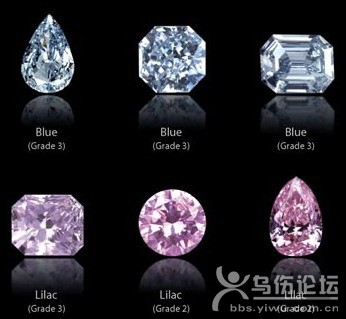黃鉆:呈淺黃、金黃色。鉆石在形成過程中,當?shù)尤〈@石晶體中的某些碳原子時(每一百萬個碳原子中,有一百個被取代),開始吸收藍,紫色光線,因而使鉆石呈現(xiàn)黃色。 藍鉆:呈淡藍色、艷藍色。鉆石在形成過程中,吸收微量硼元素,鉆石便顯天藍色。