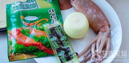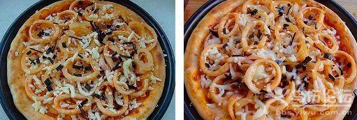 DIY新奧爾良烤肉披薩-魷魚披薩 原料: 披薩餅坯、酷客100新奧爾良腌料3勺、魷魚1條、洋蔥半個、海苔、叉燒醬1勺、醬油1/2勺、辣椒粉少許、孜然、白芝麻各適量、披薩醬。 做法: 1、將魷魚的紅褐色表皮撕掉,掏出肚內(nèi)類似塑料片的脊椎骨、白色粘膜;用廚房用紙吸去水分,切成均勻的圈。 2、魷魚圈中加入酷客100新奧爾良腌料3勺、叉燒醬1勺、醬油1/2勺、辣椒粉少許抓勻,裝入保鮮袋入冰箱冷藏室腌制30分鐘。 3、洋蔥去皮切圈,抖散。 4、腌制的魷魚取出待用。 5、烤盤抹上一層黃油,發(fā)酵好的面團(tuán),按壓排氣,松弛10分鐘;放入烤盤中慢慢推開,用叉子扎眼。 6、在扎好孔的面皮上均勻的抹上披薩醬料,放入預(yù)熱180°的烤箱中烤10分鐘后取出。 7、取一鐵板燒至9成熱,將腌制好的魷魚平鋪在鐵板上。 8、魷魚烤至卷起發(fā)白,放入洋蔥炒出香味。 (炒制時間不可過長,影響洋蔥的口感及成菜外觀) 9、撒上孜然粒、白芝麻,快速炒勻即可盛出。 10、披薩餅坯取出,撒上少許馬蘇里拉奶酪絲。 11、將餡料均勻的放在餅上,餡料之間適量的撒上奶酪絲。