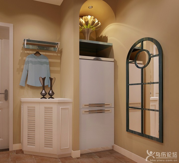 門廳效果圖,門廳不大,鞋柜也是做成轉(zhuǎn)角的形式,空間看起來會更好,由于廚房很小,冰箱就放在門廳了,給單獨(dú)的一個空間美觀而實用。