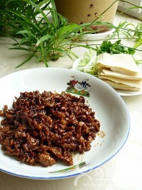 1  材料:肉絲,千張(豆腐皮),蔥,姜,香菜 調(diào)料:料酒,耗油,醬油,雞精,甜面醬。