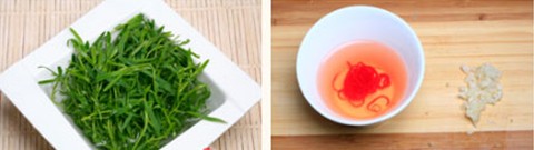 2、紅椒切絲、蒜拍末;