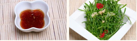 4、將調(diào)好的汁倒入芝麻菜中,撒上紅椒絲、蒜末即可。