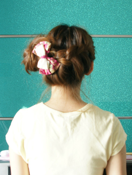 : 取一邊耳后的頭發(fā),橫向編 編啊編,編啊編,注意編的時候只加下面一股哦~ 在另一側(cè)的耳朵后面,收尾 美發(fā)完成,快點動手學習吧