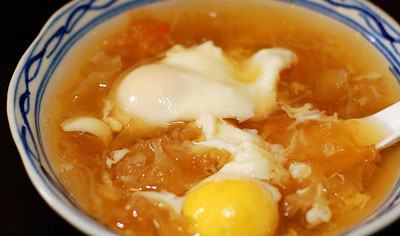 配料:腐竹皮一塊,紅棗五顆,雞蛋一個(gè),冰糖適量。 做法:腐竹皮洗凈泡水至軟,雞蛋去殼攪勻待用,紅棗去核,用四碗水煮滾后,放入腐竹皮、紅棗與冰糖,用小火煮30分鐘,再加入雞蛋攪勻即可食用。