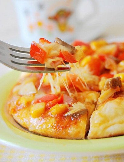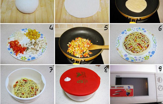 原料: 1、面團:高粉200克、牛奶(或溫水)130ml、糖10克、鹽1/2小匙、酵母1/2小匙、油1大匙(黃油、橄欖油、玉米油、葵花籽油皆可)。 2、餡料:必備的是洋蔥、奶酪和意面醬(或番茄醬),其它可隨意,這里用到了紅椒、甜玉米粒、蘑菇和火腿。 工具:平底鍋、微波爐。 做法: 1、“面團”中除油外的所有材料混合揉成面團,再加入油一起揉,其間摔打幾次,一直揉至面團光滑,蓋布,溫暖處發(fā)酵至2、3倍大; 2、發(fā)好的面團用手輕輕揉出里面的空氣,滾圓后靜置15分鐘;然后取一塊面團,將面團搟成比微波器皿稍微小一點的餅皮,厚度約為0.3cm,用牙簽扎上孔,以免受熱時鼓起,但要留一圈邊緣不扎,再次發(fā)酵30分鐘; 3、平底鍋中抹油,熱后放入餅皮,蓋蓋,小火烙至餅皮底部焦黃,一定注意只是烙一面哦,這時餅皮已經(jīng)八分熟了; 4、蔬菜都洗凈瀝干水分,切丁,火腿切; 5、平底鍋中加入少許油(黃油最香),熱后先倒入洋蔥炒出香味,然后再倒入其他蔬菜略微翻炒,這樣做是為了去除蔬菜中的水分,也減少了之后的烹調(diào)時間; 6、餅皮上抹上一層意面醬(或番茄醬),留邊緣不抹;撒上一層奶酪絲(或奶酪丁);撒上火腿;撒上蔬菜;最后再鋪上一層奶酪; 7、8、將準(zhǔn)備好的pizza放入微波專用器具,蓋上蓋子,打開排氣孔; 9、放入微波爐,中大火5分鐘,時間要根據(jù)自己微波爐的功率調(diào)整,其間不妨打開觀察一下。