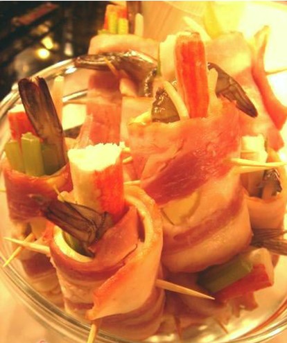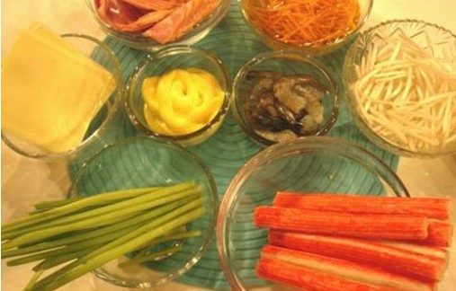 原料: 培根、青蝦、蟹柳棒、香芹、綠豆芽。 輔料:奶酪片、橙皮。 調(diào)料:鮮貝露。 做法: 1、把鮮蝦剪去頭部,去殼,留尾,用美極鮮醬油和鮮貝露腌10分鐘; 2、豆芽去頭留尾。香芹切成寸段,與豆芽一樣長。蟹柳棒切成寸段,與豆芽等長。奶酪片切成與培根一樣寬的片; 3、將生培根鋪平放上奶酪,加上所有原料,卷成卷,一頭露出原料。用牙簽固定。做十個; 4、用微波爐容器放上卷,放進微波爐,中火5分鐘就好了。 5、橙子皮切絲,鋪盤底,最后把卷碼上,撒在面上少許。 小提示: 1、在卷里加入奶酪除了可以借味,而且奶酪?guī)缀鯘饪s了牛奶中所有的天然營養(yǎng)成分,含有豐富的鈣且容易被人體吸收,是理想的補鈣食品,有利兒童骨骼生長和強壯,對小孩子們很好。 2、如果不愛吃水果,家長可以嘗試將許多種新鮮水果放在一個淺盤中,同時附上一杯酸奶,端給孩子;為了讓孩子們有新奇感,也可以嘗試用兩三種不同顏色的水果做成水果串,或把水果切成塊后與酸奶混合后放到模具里凍成冰。對于不愛吃蔬菜的小孩子,為了增加蔬菜的攝入量,可以弄點新鮮蔬菜讓孩子蘸上醬吃;一種蔬菜換些花樣做,比如胡蘿卜可以切片、切絲、切丁,可以蒸,可以煮,也可以做成沙拉,這都會讓孩子更喜歡。 |