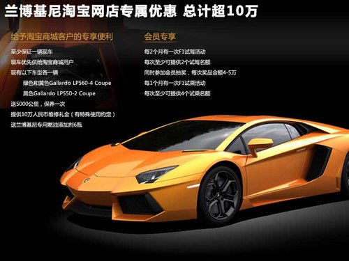 據(jù)了解,消費(fèi)者在蘭博基尼淘寶店選購相關(guān)車型,可以享受專屬優(yōu)惠政策,包含送5000公里免費(fèi)保養(yǎng),10萬元人民幣維修禮金及蘭博基尼專用燃油添加劑等,另外還有F1賽道試駕機(jī)會(huì),總價(jià)值超過10萬元。其中Gallardo LP-560-4 coupe綠色/黃色及Gallardo LP550-2 Coupe黑色有現(xiàn)車各一臺(tái),其他車型需要預(yù)定,一般預(yù)定周期為4-6個(gè)月。