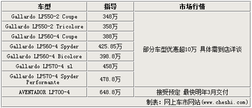 另據(jù)了解,在法拉利公布7年免費(fèi)保養(yǎng)政策后,不少在法拉利與蘭博基尼直接抉擇的消費(fèi)者,最終選擇了法拉利,這無疑讓蘭博基尼感受到了競爭壓力,進(jìn)行降價(jià)促銷也在情理之中,并且不僅是在網(wǎng)店購買有大幅優(yōu)惠,直接到店優(yōu)惠幅度甚至更大。蘭博基尼多家授權(quán)經(jīng)銷商處銷售人員表示,網(wǎng)上的優(yōu)惠幅度到店直接購買同樣能夠達(dá)到,甚至還會(huì)有更大的降幅,具體幅度消費(fèi)者需到店詳談,不過僅針對(duì)Gallardo系列車型,而AVENTADOR LP700-4接受客戶預(yù)定,現(xiàn)在訂車預(yù)計(jì)明年3月交付。