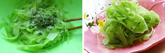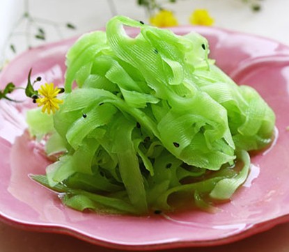 夏天一來到,青嫩的筍兒呱呱叫。其實(shí)筍是不會(huì)叫滴啦,是俺對(duì)青翠欲滴去了皮兒滴筍的熱愛嘛。萵筍口感鮮嫩,色澤淡綠,如同碧玉一般,所以有個(gè)好聽的名字“碧玉風(fēng)尾”。夏天吃筍好處多,它不僅嫩爽青翠,而且萵筍中無機(jī)鹽、維生素含量較豐富,微量元素鋅、鐵,鉀離子也含量豐富,尤其是含有較多的煙酸。因?yàn)楹浟枯^高,夏天吃萵筍,有利于促進(jìn)排尿,減少對(duì)心房的壓力,對(duì)水腫、高血壓極為有益,同時(shí)它對(duì)人的基礎(chǔ)代謝、甚至情緒調(diào)節(jié)都有重大影響。因此在炎炎的夏日,來一盤清爽的拌萵筍,絕對(duì)有助于消除緊張,緩解壓力、祛暑潤(rùn)燥、安神鎮(zhèn)靜的作用。 原料:萵筍1根、姜汁1勺、蒜汁1勺、鹽1茶匙、糖1茶匙、醋1勺、麻油1勺、芝麻1勺。 做法: 1、原料:萵筍1根、姜汁1勺、蒜汁1勺、鹽1茶匙、糖1茶匙、醋1勺、麻油1勺、芝麻1勺; 2、萵筍去皮擦成長(zhǎng)條狀; 3、用全部調(diào)料拌勻; 4、淋上麻油,清爽開胃的爽口萵筍絲就拌好了。 |