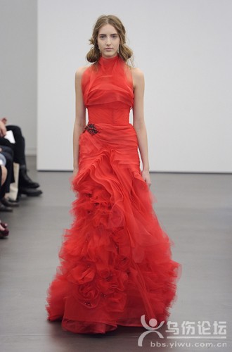 如這款艷麗的紅色A字裙婚紗,不規(guī)則的立體褶皺設計,令紅色更加生機勃勃,充滿著活力,相信是講究吉祥、喜慶的中國新娘的大愛。