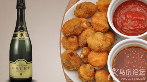 這是一個鮮為人知的秘密,油炸食物與香檳其實(shí)是絕配。從這個角度來看,黑中白香檳(用像黑皮諾那樣的深色葡萄釀制的白起泡酒)和油炸口蘑絕對是黃金搭檔。在充滿果香的黑中白香檳的襯托下,蘑菇的鮮香被發(fā)揮得更加淋漓盡致。不過,像美國的格魯特(Gtuet)、香桐(Chandon)和菲拉酒莊(Gloria Ferrer)的黑中白香檳,對油炸口蘑來說甜度顯得稍微高了一些。