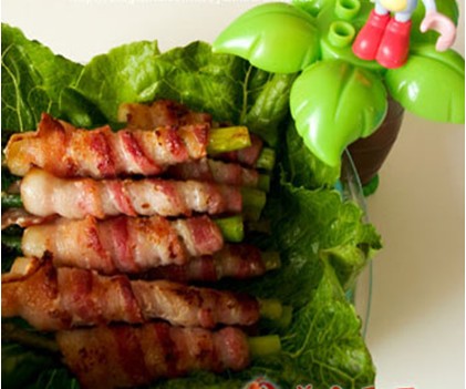 3、油鍋中不用放油,直接放入蘆筍卷。因為培根在煎的過程中會出很多油。煎到培根熟了就好了。