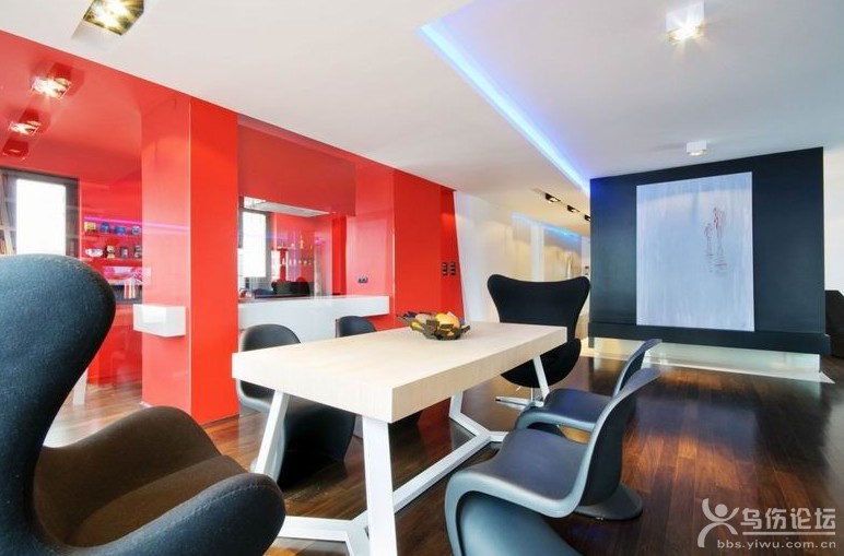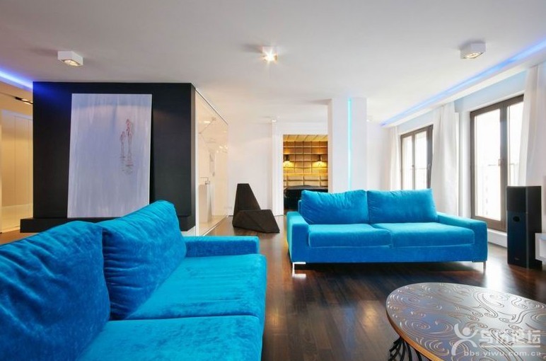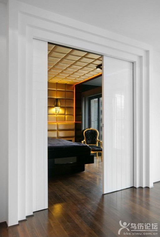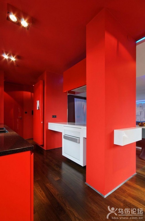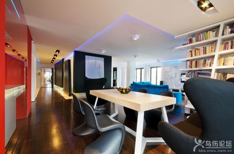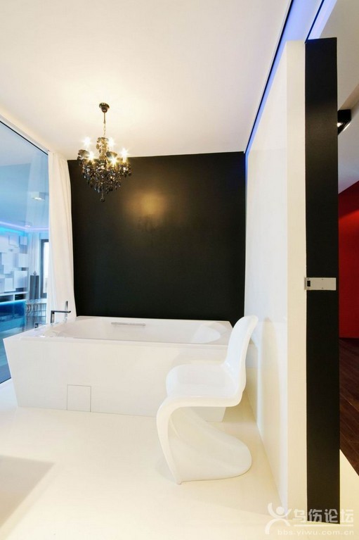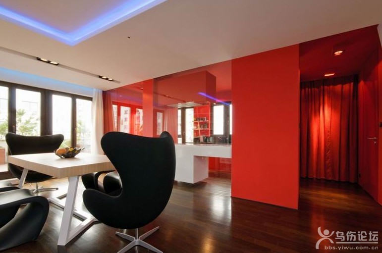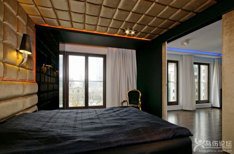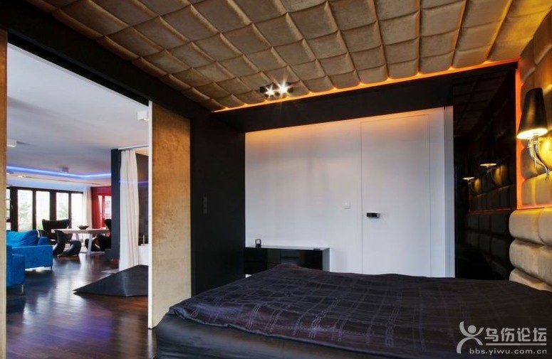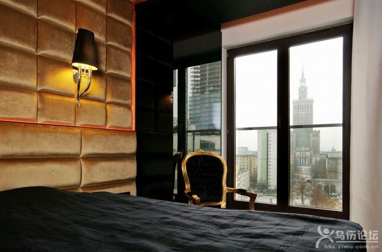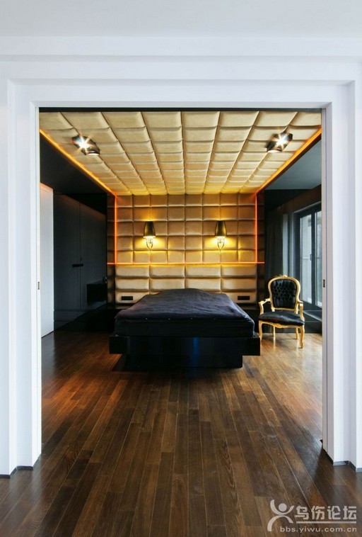 這家設(shè)計(jì)時(shí)尚的公寓靠近華沙市中心,由波蘭的HOLA Design擔(dān)當(dāng)室內(nèi)設(shè)計(jì)。設(shè)計(jì)師將內(nèi)部裝飾設(shè)定為深色調(diào),搭配深褐色的木地板和明亮的紅色廚房。大紅色的廚房甚至成為了住宅的核心。 在華沙市中心的公寓里,這里可謂得天獨(dú)厚,不僅交通方便,而且還能一覽波蘭最標(biāo)志性建筑——文化宮的美麗景色。在包含廚房的寬闊客廳里,設(shè)計(jì)師用火紅的顏色打造用餐區(qū)和廚房,是不是想讓用戶(hù)抱著滿(mǎn)腔熱情去打造每一頓美食呢?用餐區(qū)用玻璃墻跟廚房進(jìn)行隔離,輕盈地把充滿(mǎn)油煙的廚房與快樂(lè)的餐廳分開(kāi)。餐廳所使用的椅子是Stylhen出品的經(jīng)典設(shè)計(jì):Egg椅和Panton椅,足以彰顯屋主的品味。 客廳那夾在黑色跟藍(lán)色碰撞的Stylhen茶幾和沙發(fā)中的,是HOLA專(zhuān)門(mén)設(shè)計(jì)打造的3D電視墻。透過(guò)電視墻的幽幽藍(lán)色燈光,仿佛是一個(gè)夢(mèng)幻的圣地。浴室巧妙地放置在客廳的中央,由玻璃墻進(jìn)行阻隔,并面對(duì)著文化宮,在沐浴的同時(shí)享受著窗外的美景,讓洗浴變成一件賞心悅目之事。浴室旁的躺椅同樣是出自Stylhen的Diamond椅。看來(lái)設(shè)計(jì)師是Stylhen的忠實(shí)粉絲也說(shuō)不定。 臥室通過(guò)雙滑門(mén)設(shè)計(jì)跟生活區(qū)分開(kāi),里面有一個(gè)隱蔽的入口通向更衣室。由于臥室是放松休息的地方,所以設(shè)計(jì)師也讓其變得獨(dú)特。臥室在整個(gè)公寓里,采取了一種截然不同的風(fēng)格。這里充滿(mǎn)了各種金色輝煌的魅力元素,金色跟典雅的黑色碰撞出火花,并跟外面白色的空間產(chǎn)生鮮明的對(duì)比。推開(kāi)門(mén)進(jìn)去,感覺(jué)是走進(jìn)了一處奢華的皇宮寢室。 |