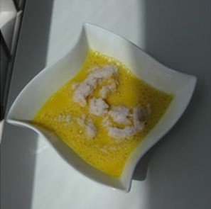 2、雞蛋打散,放入魚肉泥,調(diào)入鹽攪拌均勻。