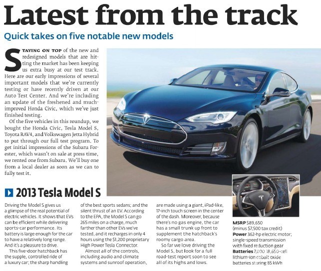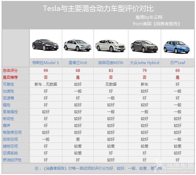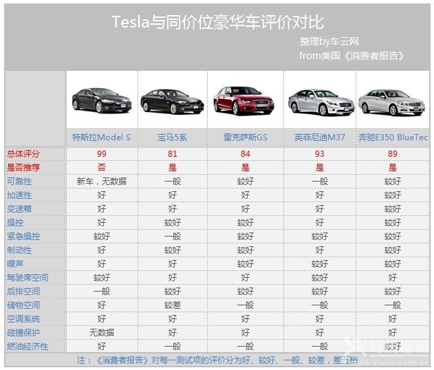| 福特110歲,通用105歲,寶馬97歲,奔馳87歲,豐田80歲……汽車元老們似乎都敗在了特斯拉這個(gè)剛滿十歲的電動(dòng)小子手上。難道這些百年老店只能洗洗睡了? 為什么是99分? 《消費(fèi)者報(bào)告》由美國(guó)消費(fèi)者聯(lián)盟主辦出版,是一個(gè)獨(dú)立的非盈利組織,主要提供產(chǎn)品測(cè)試和產(chǎn)品信息。為了保證測(cè)試公正性,這份雜志從未登過廣告,所有測(cè)試產(chǎn)品均為自掏腰包購(gòu)得,靠800萬付費(fèi)用戶維持運(yùn)營(yíng)。 2010年10月,《消費(fèi)者報(bào)告》采用匿名的方式以5000元訂金向Tesla訂購(gòu)了Model S,并額外選裝了85kWh大容量電池組、Nappa皮革座椅、全景天窗、氣動(dòng)懸掛系統(tǒng)等。在漫長(zhǎng)的兩年等待之后,Tesla Model S于2013年1月交付雜志。 《消費(fèi)者報(bào)告》測(cè)評(píng)Tesla Model S 根據(jù)《消費(fèi)者報(bào)告》的實(shí)際測(cè)試,Model S 能夠在5.5秒從靜止加速到96.6千米/時(shí)(60英里/時(shí))。并擁有約321公里(200英里)的續(xù)航里程。所安置在底盤中的平面式電池組會(huì)幫助車輛壓低重心,在操控時(shí)也會(huì)帶來更大的慣性。 《消費(fèi)者報(bào)告》汽車測(cè)試總監(jiān)Jake Fisher表示:“Tesla Model S充滿了科技的創(chuàng)新感,它的加速、操控與剎車都與跑車相仿,并擁有了豪華車的舒適型和靜謐性,而且它還擁有比Hybrid油電混合車型更好的能源效率! 《消費(fèi)者報(bào)告》列舉出了Tesla Model S的主要優(yōu)點(diǎn): √實(shí)用、不費(fèi)油、零排放的電動(dòng)車 √目前可以買到的最牛的電動(dòng)車、最小的里程焦慮、充電時(shí)間快 √在提供舒適的駕駛體驗(yàn)同時(shí),也擁有絕佳的操控和制動(dòng)性能 √彈射般的加速度 √最安靜的汽車 √觸摸屏響應(yīng)速度快、易讀,融合高科技和互聯(lián)駕駛 √第三排座椅對(duì)兒童實(shí)用 √如果附近有Tesla充電站,可以免費(fèi)充電 √駕駛tesla極其吸引眼球 看,真正能打動(dòng)《消費(fèi)者報(bào)告》的,并非僅僅因?yàn)門esla Model S是一臺(tái)電動(dòng)車,更多的是他很好地平衡了性能、操控、經(jīng)濟(jì)性。報(bào)告中還提到,福特Focus電動(dòng)車是最接近Tesla駕駛樂趣的車型,但與tesla的性能和實(shí)用性尚有較大差距。 當(dāng)然,作為電動(dòng)車,321公里的續(xù)航里程相對(duì)于傳統(tǒng)內(nèi)燃機(jī)的車輛來說,還是有些捉襟見肘。充電時(shí)間無疑也會(huì)比加油時(shí)間更加漫長(zhǎng),而轎跑設(shè)計(jì)的造型也會(huì)讓后車窗的玻璃面積受限制,Model S也并非毫無缺點(diǎn): ×有點(diǎn)貴 ×不適用于長(zhǎng)途旅行 ×大容量電池、Twin-Charging等對(duì)提高車的效能非常有用,但需要額外付款 ×當(dāng)天氣寒冷的時(shí)候續(xù)航里程急劇減少 ×儀表盤的控制按鈕太少 ×這個(gè)價(jià)位的汽車?yán)響?yīng)提供更多舒適和高科技配置 ×上網(wǎng)容易導(dǎo)致分散注意力 ×Tesla是個(gè)新公司,因此在可靠性、二手車估值、服務(wù)網(wǎng)絡(luò)等方面蘊(yùn)含風(fēng)險(xiǎn) 最高分≠最好車 有趣的是,即便《消費(fèi)者報(bào)告》給予了Tesla Model S高達(dá)99分的評(píng)分,但并未將其納入值得推薦的車型之中。理由也很充分:Model S自2012年6月交付第一批汽車以來,尚不足一年,目前所獲得的車主反饋、行駛情況遠(yuǎn)不足以對(duì)其是否值得購(gòu)買做出判斷。只有通過各項(xiàng)駕駛測(cè)驗(yàn)、具有平均以上的可靠性和在碰撞試驗(yàn)中過關(guān)的車型才會(huì)被推薦,而Tesla Model S充電及保修網(wǎng)絡(luò)也還在起步階段,所以,他的可靠性還是一個(gè)迷。 同樣獲得過99分的2007款雷克薩斯LS 460L就被《消費(fèi)者報(bào)告》給予了肯定的推薦。從2003年起,雜志每年都會(huì)對(duì)車型進(jìn)行可靠性的年度調(diào)查,并對(duì)用車數(shù)據(jù)進(jìn)行分析。由于得到了一定數(shù)量的正面回饋,因此被持續(xù)提名推薦。 雷克薩斯LS的可靠性評(píng)價(jià) 特斯拉確實(shí)在性能、空間等方面明顯勝出美國(guó)市場(chǎng)上的其它新能源車型,但日產(chǎn)leaf盡管只獲得了69分的評(píng)價(jià),仍然獲得了推薦。從主要評(píng)價(jià)指標(biāo)來看,leaf在空間表現(xiàn)上的不盡如人意拖了它的后腿,但由于上市時(shí)間較早,《消費(fèi)者報(bào)告》連續(xù)在2011、2012年獲到了眾多車主的可靠性反饋。在這套評(píng)價(jià)體系里,“高分低能”或者“低分高能”都是再正常不過的事情。 當(dāng)然,在Tesla嶄獲史上最高分這一事件上,更多人懷疑的是電動(dòng)車性能是否已經(jīng)全面超過傳統(tǒng)燃油車?果真這樣的話,那些擁有幾十年甚至上百年造車歷史的傳統(tǒng)車企,簡(jiǎn)直就要顏面掃地。 傳統(tǒng)燃油車仍然是道路上的重頭戲,《美國(guó)消費(fèi)者報(bào)告》的車輛評(píng)價(jià)體系也基于此類。但如果用這套體系去評(píng)價(jià)電動(dòng)車或混合動(dòng)力車型時(shí),不可避免地會(huì)“水土不服”。比如說新能源車在燃油經(jīng)濟(jì)性、內(nèi)部空間等方面,無法與傳統(tǒng)汽車站在同一起跑線上比較。 Model S之所以能夠獲得如此高的分?jǐn)?shù),主要原因在于這是一臺(tái)純粹的電動(dòng)車。得益于電動(dòng)機(jī)驅(qū)動(dòng),讓傳統(tǒng)
